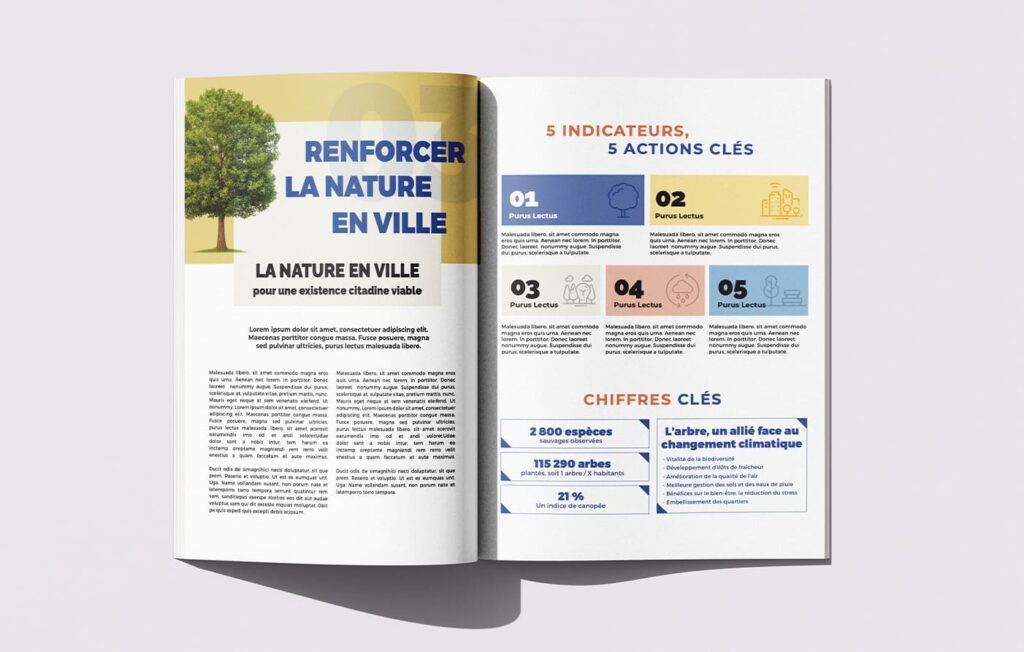 Solution Conception de la mise en page complète du rapport, en structurant les données et les contenus éditoriaux pour offrir une lecture fluide et accessible, tout en respectant les codes graphiques institutionnels de la Ville.