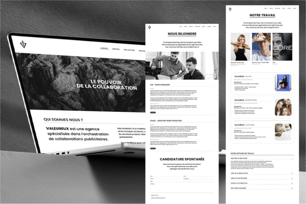 Solution Conception et développement du site internet de Valeureux, en traduisant son positionnement premium et juridique dans une interface claire, élégante et rassurante, au service de la lisibilité des contenus.